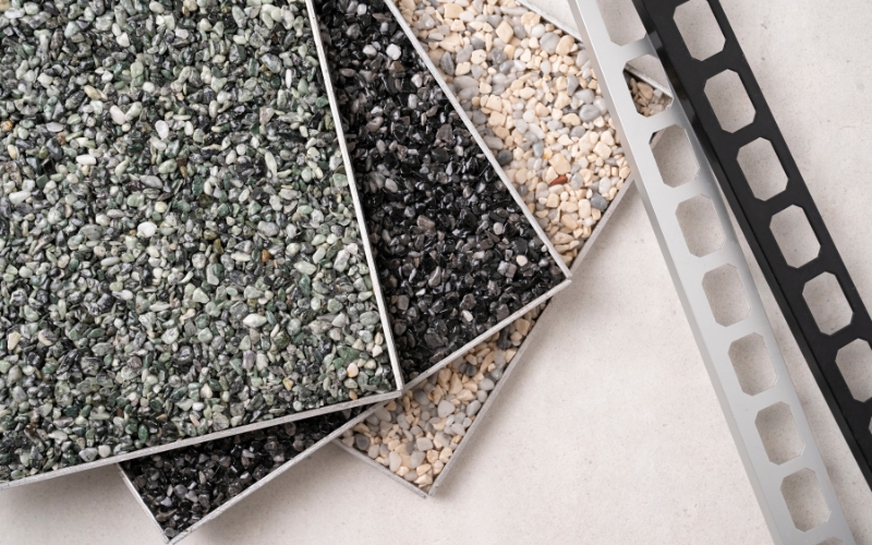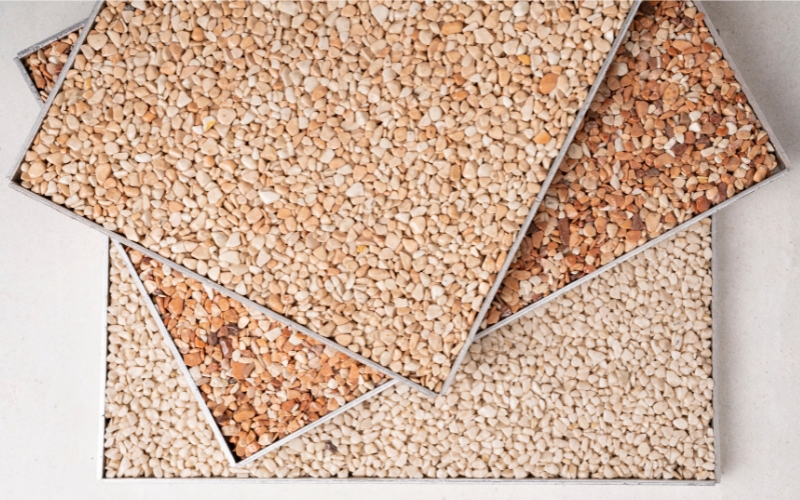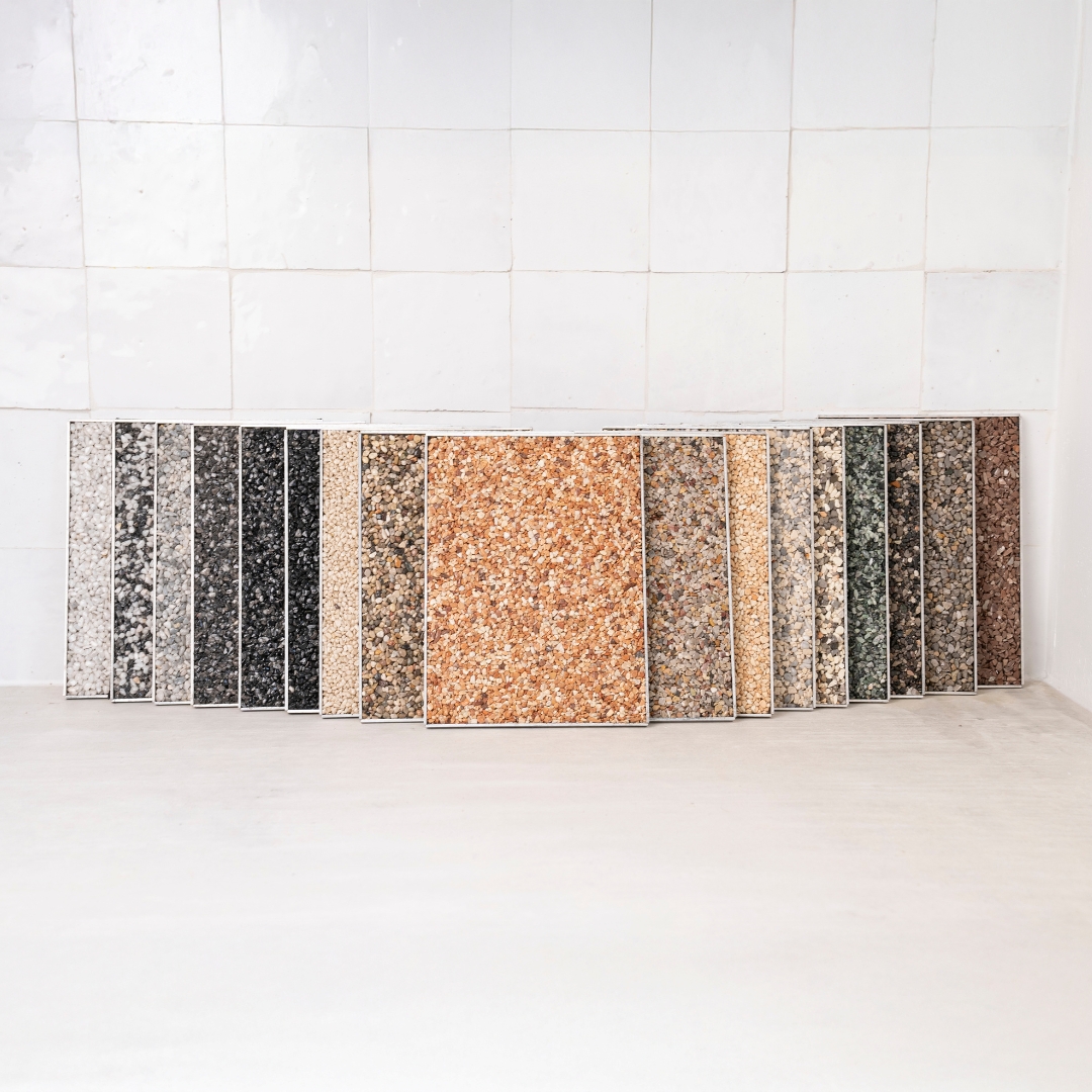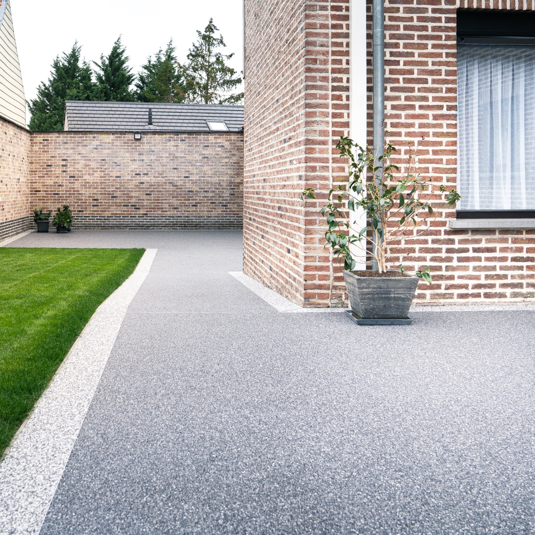 Verhardingen in poly-beton, klinkers, tegels, natuursteen, grindmatten of steentapijt